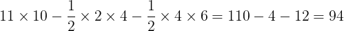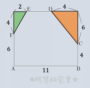 長方形の面積ー緑の三角形の面積ーオレンジの三角形の面積であり,すなわちこの図形の面積は