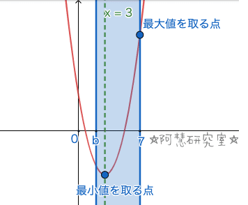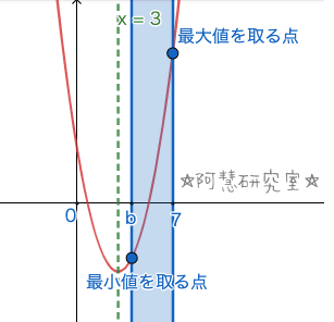 であり。二次関数f(x)がb≦x≦7の範囲における最大値や最小値はbとx=3の相対位置に関わるから,以下の2つの場合に分けられる。